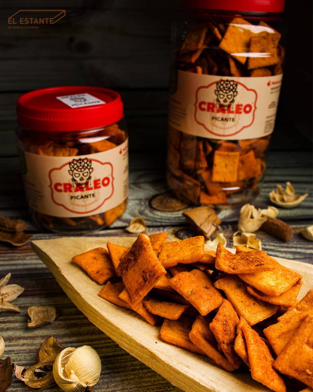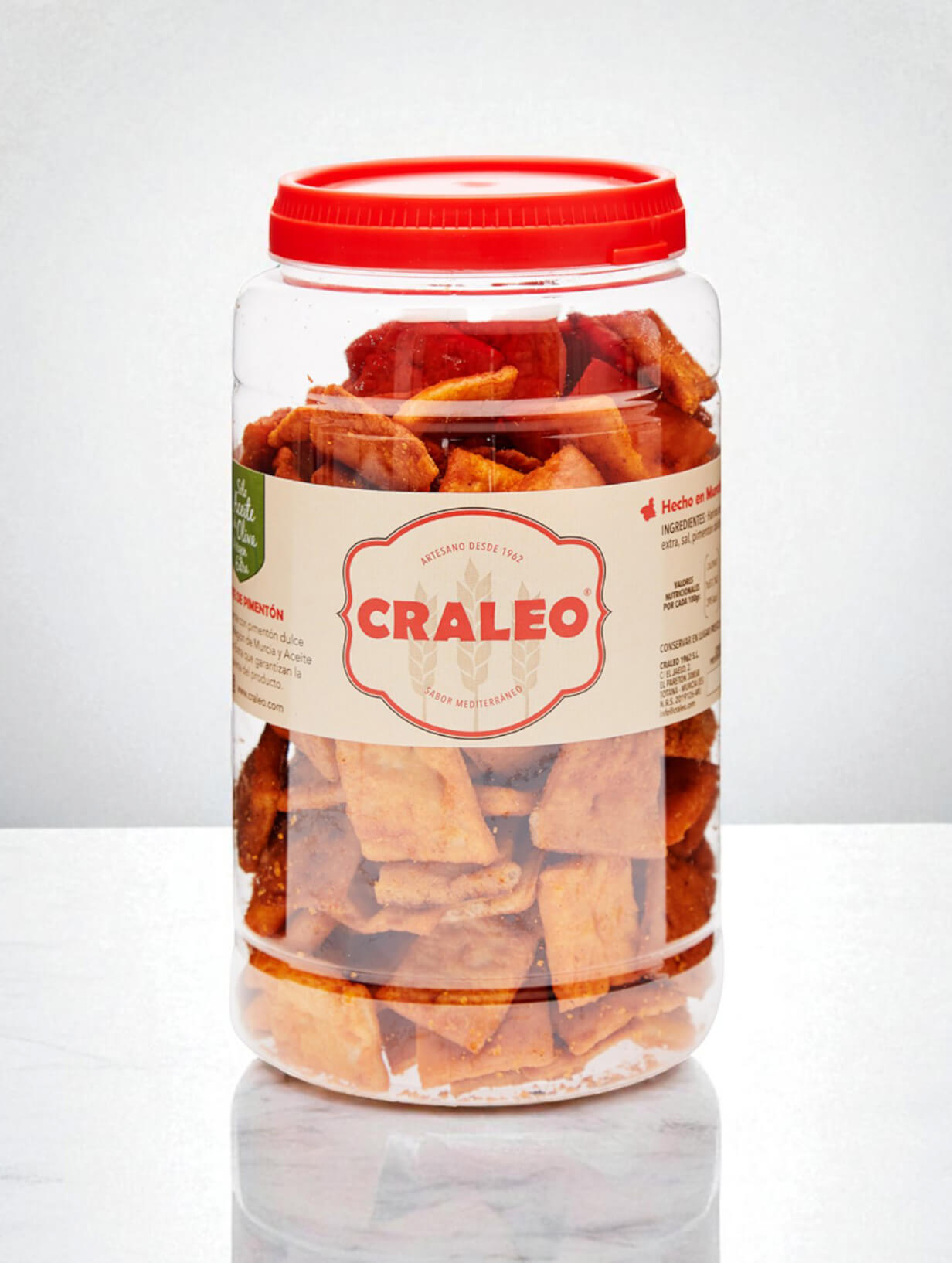 Masa de pan horneada con aceite de oliva virgen extra y pimentón de Murcia. Este crujiente de pimentón es ideal tanto para acompañar como para tomarlo como snack.