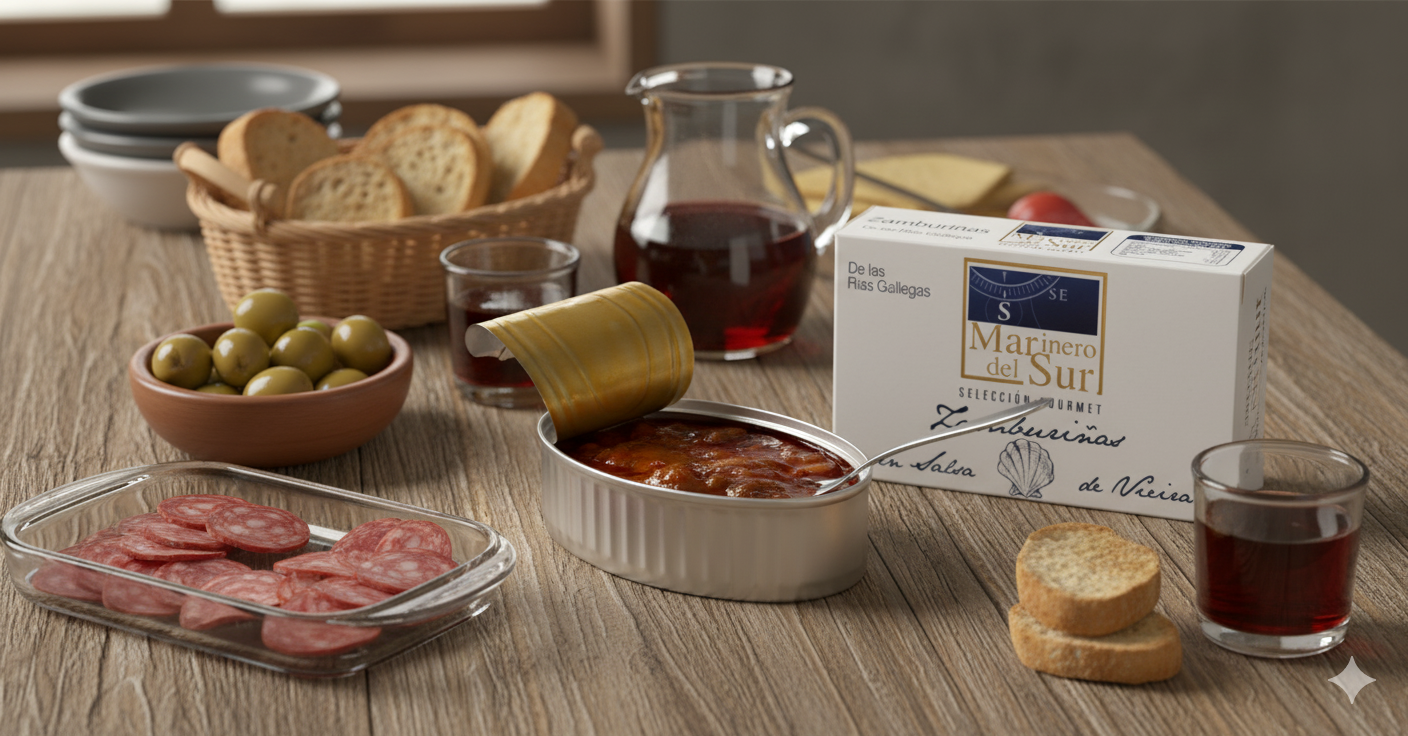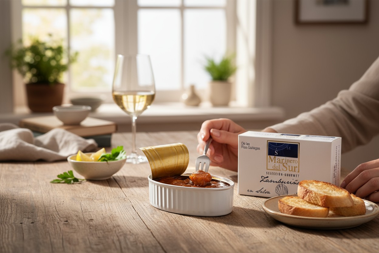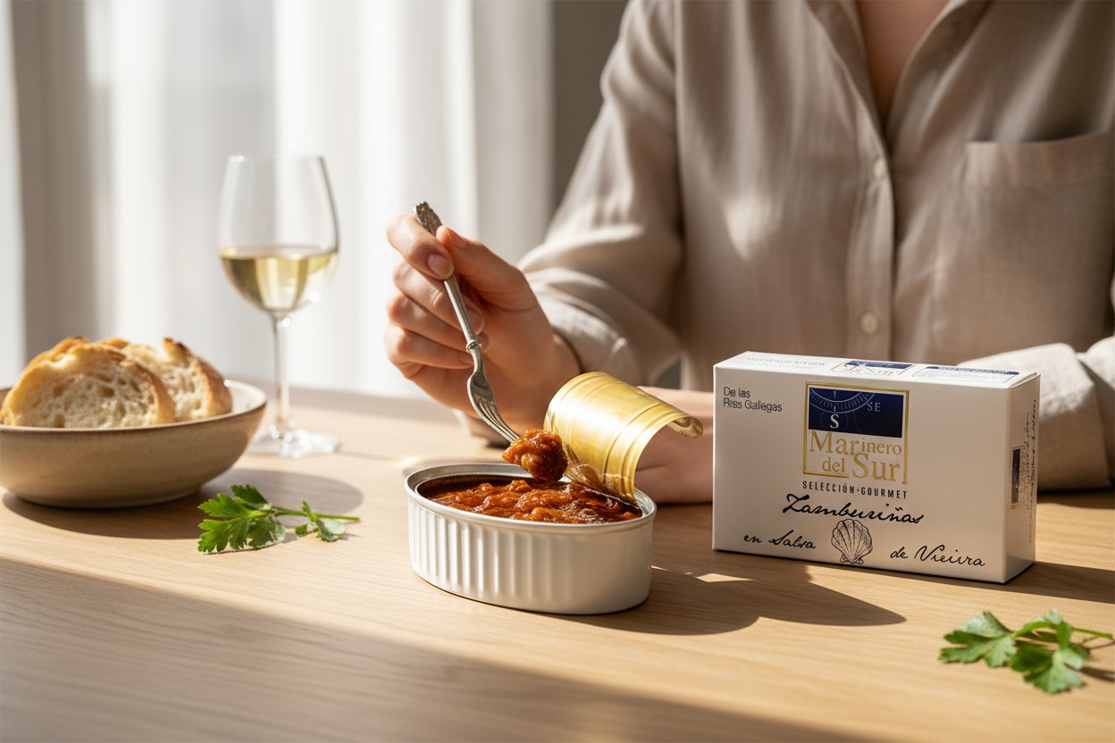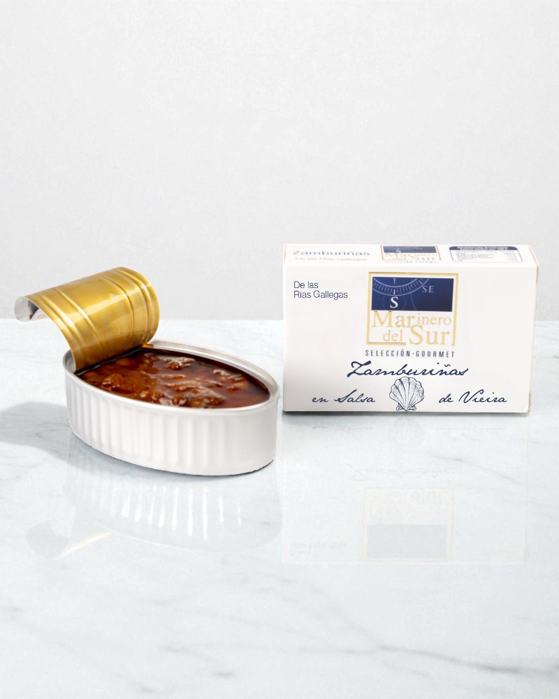 Aunque la marca es murciana, las zamburiñas vienen directamente de las Rías Gallegas. Estas zamburiñas se limpian una a una y se envasan a mano. Se acompañan de una salsa tradicional de vieira, cuya receta se elabora a fuego lento con ingredientes naturales como cebolla, tomate, vino y especias.